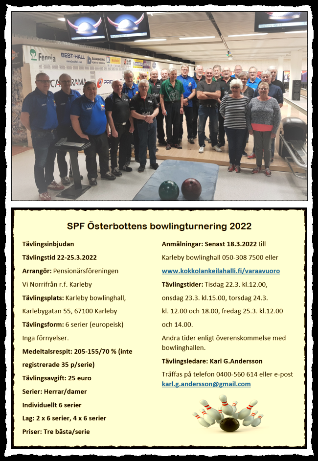SPF ÖSTERBOTTENS BOWLINGMÄSTERSKAP I KARLEBY 21.-24.3.2023 Läs mer